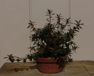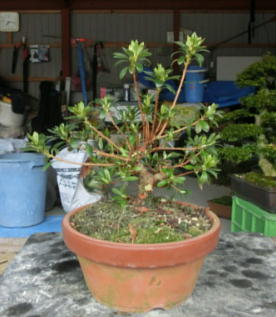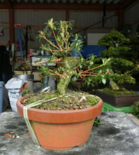 And I have other four young trees of Hikorin. After pruning and wiring two of them, I made them into a cascade style three years ago. Therefore I have to repot them after blooming in July. Since they already had the basic style of cascade, I could not use them as the materials for my web site last year. And since one of them is like a bush and does not have any good points to make it into a small bonsai now, I cannot use it as a material. Therefore I used the last one as a material to make it into mini bonsai.
