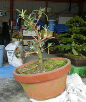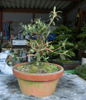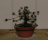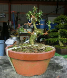 This material was one of some slips which I had grown to make roots of the large trees of Shuho no hikari in the nursery. Since I succeeded in grafting the saplings on the bottoms of trunks, I have kept it in the pots. Though I have other young tree of this variety, I cannot make it into a small bonsai because the distance between the bottom of trunk and the first curve is more than 10 cm. If it will have a good shoot near the bottom of trunk in the future, I may be able to make it into a mini bonsai.