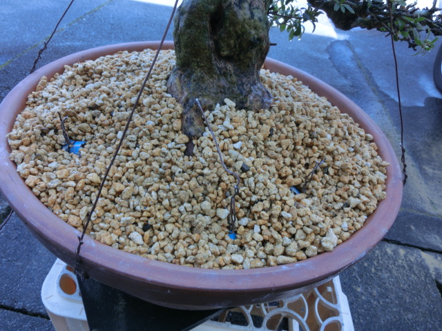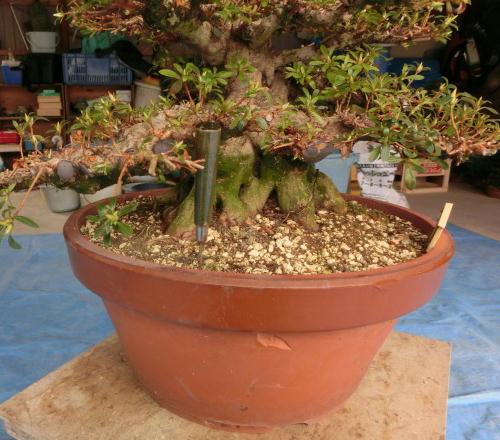If I knew that the water does not sink down easily when watering a large satsuki in January, I always have to judge when I repot it by pushing an eyeleteer into the soil in the pot. If I can push it into the soil easily, I do not have to repot it this March, but next March.
