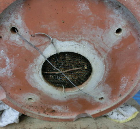 At first, I cut the wires with which the tree was fixed and remove them. And I see the net on the bottom of the pot and know whether the roots are coming out from it or not. It indicates the conditions of the roots in the pot. In case of satsuki trees, if the roots are coming out from the net, we have to repot them as soon as possible.