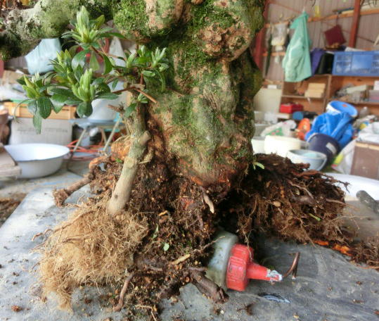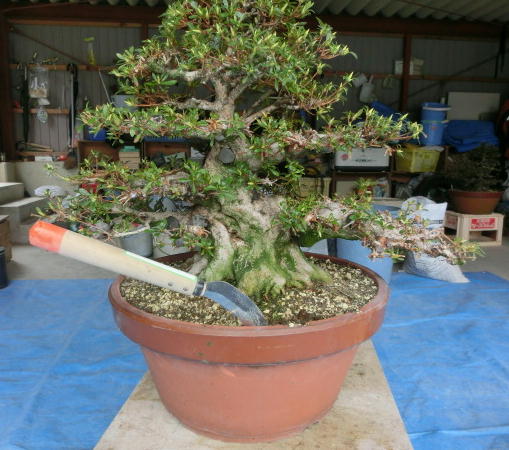 I would like to introduce the special case of repotting of a large satsuki tree. Since I have a lot of satsuki trees (about 400) on the shelves and in the nurseries, some of them die every year. It is the dispensation of nature, but a few of them die because of my errors. But even if they were tiny, they will be making satsuki trees weak for a long time and may die in some or several years. It is a great pity.