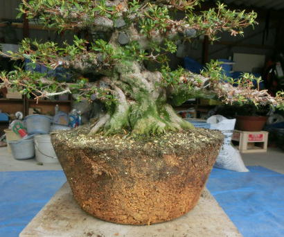 I repotted it into a large terracotta pot (45 cm) in April 2006 because some parts of the wooden pot were rotten. The height was 41 cm, and the trunk girth was 44 cm. And I repotted it in March 2011 because it had passed 5 years since the previous repotting and the soil in the pot had been hard. The height was 43 cm, and the trunk girth was 47 cm.