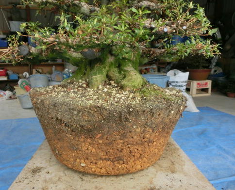 I let an English youth plant three large satsuki trees in large terracotta pots (45 cm) after removing the soil and washing the roots in March 2009 though I pruned them, who had come to our house to study how to grow satsuki trees and how to make them into bonsai for 4 weeks from March to April. Of course though they were not very good in the style, they were not weak when we dug them from the nursery. But one of them (Kozan) is dying now. And other one of them is Nikko which I would like to introduce how to repot.