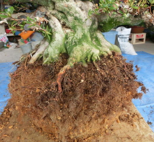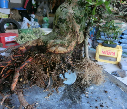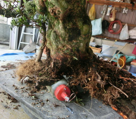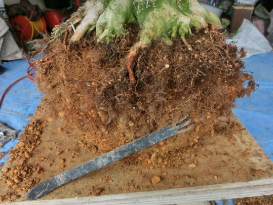 Secondly I removed the dusts and soil along the nebari, using a bamboo stick. Since I must not hurt it, I had better not use an eyeleteer. And I removed the soil at the end of root ball carefully, using a one-hooked rake. In this case, I did not remove a lot of thin roots to make this tree grow prosperously after repotting. Therefore the nebari of the front side and back side keeps a lot of thin roots.