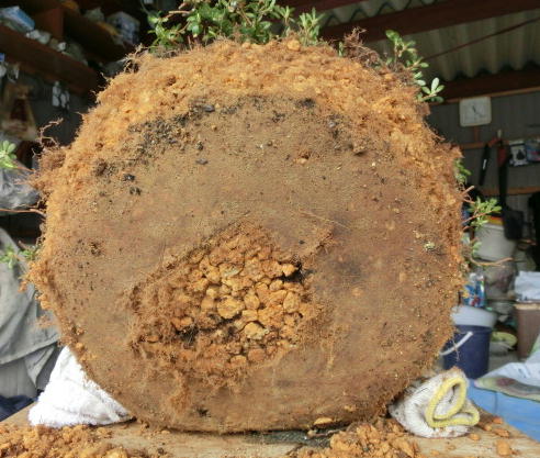 When the soil in the pot is hard, we cannot pull out the satsuki tree from the pot. I always use a saw-edged sickle to separate the soil from the pot.