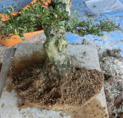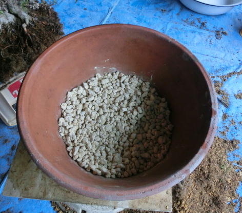 And I knew that this tree still had the large scar which I had made when I had cut the trunk short in January 1993. And since I decided to repot it in the same terracotta pot (45 cm), I put the large grains of Kanuma soil on the bottom of it.