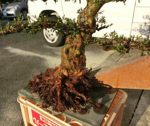 When I repotted this tree on March 16th, I did not have to fasten it with wires completely because the nebari is already completed. I fastened it with wires loosely lest they should hurt the nebari. The height is 46 cm. The trunk girth is 49 cm.