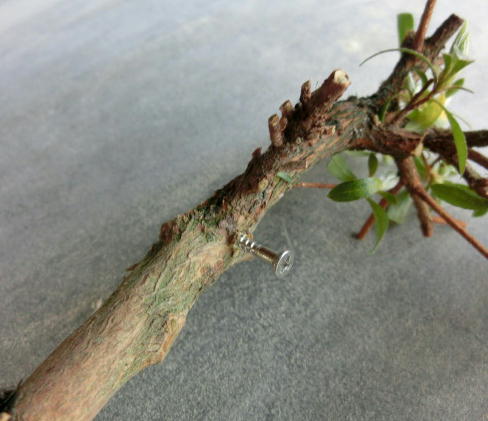 Since I confirmed that this graft is suitable for the place, I made a cut of u-letter on the bottom of this tree with a knife so that it may be matched with the trunk of the graft, and scraped the bark of the graft which will touch the cut of the bottom of the tree. And I drove the screwed nail to fix it into the a little bit upper part of it than the place where the graft contacts the bottom of the tree so that it might be easy for me to drive the screwed nail into the bottom of the trunk.