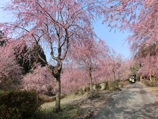 Though I think that even the oldest trees in the garden are not 20 years old, since they are given fertilisers every year and the plants under them are cut in every summer, their trunks are growing very thick. Therefore the weeping branches are so long that they can have a lot of flowers. We could not see them without sigh of admiration.