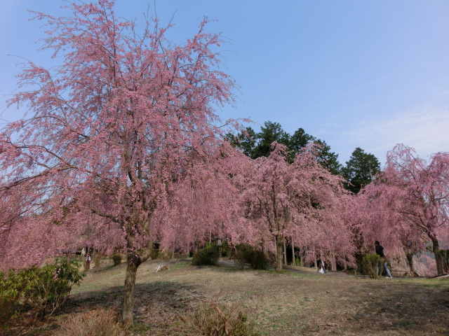 These flowers of weeping cherry trees are very gorgeous. We went seeing them in the weeping cherry tree garden on April 16th 2015, which is located between the deep mountains on the border between Mie and Nara prefectures. Since the garden was made about 15 years ago and a lot of weeping cherry trees were planted though some of them have the white flowers, all trees are young. But it is said that the number of them was more than 1,300 last year because a lot of young trees are planted every year. When we went there on April 23rd, 2014, a lot of them were finishing flowering, but last year we were much satisfied with a lot of beautiful flowers at the start of full-blooming which I have not seen in my life. A lot of flowers of weeping cherry trees are extremely beautiful. Fortunately we can see the white flowers in the right photo though other trees finished blooming white flowers. Please enjoy them.