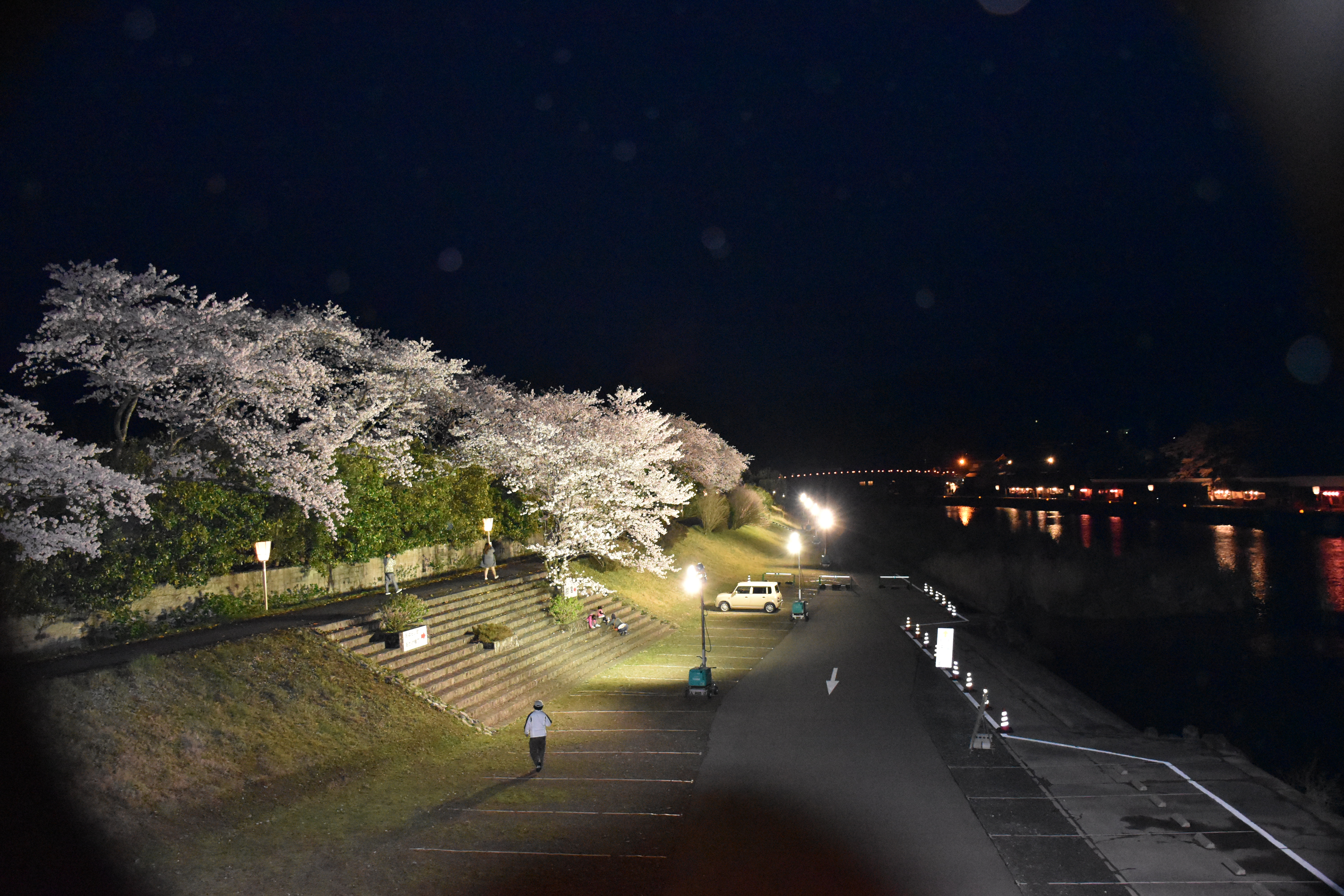Lastly, I would like to introduce the beautiful scenes of cherry blossoms by the river of Isuzu near Naiku (Ise Grand Shrine) at night. Since I was so busy that I did not have any time to spare to go seeing cherry blossoms in the daytime, we went seeing them which were lit up this year.