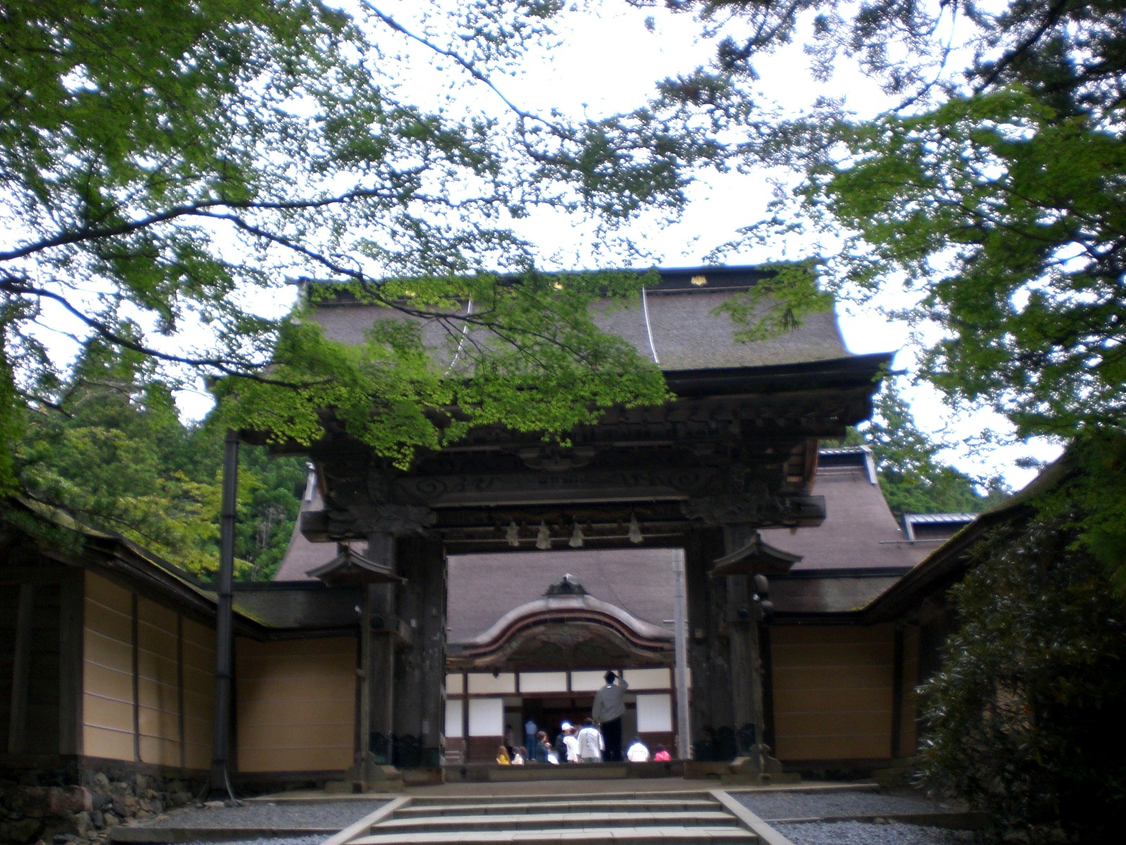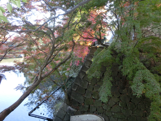 Recently it is so warm in late autumn that the leaves of Japanese maple trees do not turn purely red or yellow. Since their change of colour depends on the districts (cold and heights above sea level), the autumnal tint front is announced by the Meteorological Agency every year. Kongobuji (the name of a great group of temples) is located in Koya town in Wakayama prefecture, whose height above sea level is about 800 m. Though we went there to warship Kukai by my car on October 9th 2010, the leaves of Japanese maple trees which were growing before the gate of main temple still were green (the left photo). I think that they would have turned red or yellow if we had visited there 50 years ago. But we can see a lot of green leaves and a small number of red ones in the same place. It is because red leaves had the sunshine longer than green leaves. The next middle and right photos were taken in the Okazaki castle on November 30th 2013 when I and my wife went to Okazaki Park to see the satsuki autumnal bonsai show by my car. This contrast between red and green colours brought me a little strange feeling.