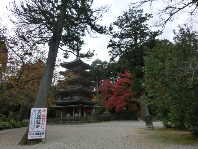 And we went to Kaijusanji (temple) in Kamo town where we had been by a long walk at my primary school days (67 years ago) to see the statue of Buddhist and five-storied pagoda in May. Perhaps they were not the national treasures at that time when it was immediately after the World War II ended. This temple is very famous not only for these national treasures but also for the autumnal tint. But since we went there before the best time to see it, some of Japanese maple had a lot of green leaves.