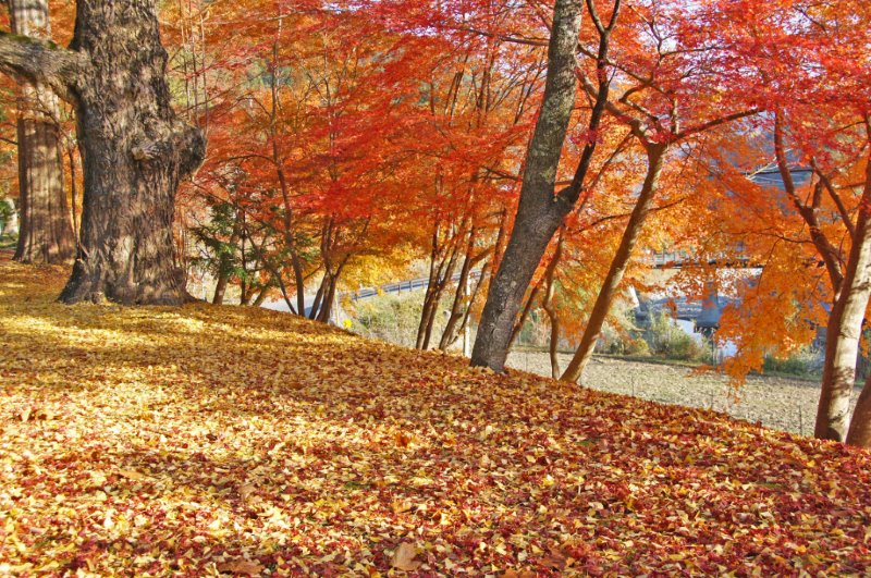 At first the chlorophyll in leaves is decomposed rapidly as hours of sunlight are shorter and shorter. Secondly the yellow of carotenoid appears and the leaves begin to turn yellow. This yellow of carotenoid is not seen in them form spring to summer under the influence of chlorophyll. When chlorophyll is decomposed in autumn, it can be seen. Thirdly when the temperature fell down much lower and a green pigment disappear, a red pigment of anthocyanin which isn’t contained in them from spring to summer originally happens to be formed in the process of phenomena of aging. Though the process of this mechanism makes leaves of plants have different changes of colours, it isn’t made clear why the red pigment is formed in them. But we can enjoy seeing pure red leaves of them when the temperature is high in the daytime and low at night, and they have a lot of sunlight, in other words, when fine autumnal days continue and the difference in temperature is great. And they are much more beautiful when we have a lot of rain in summer and autumn.