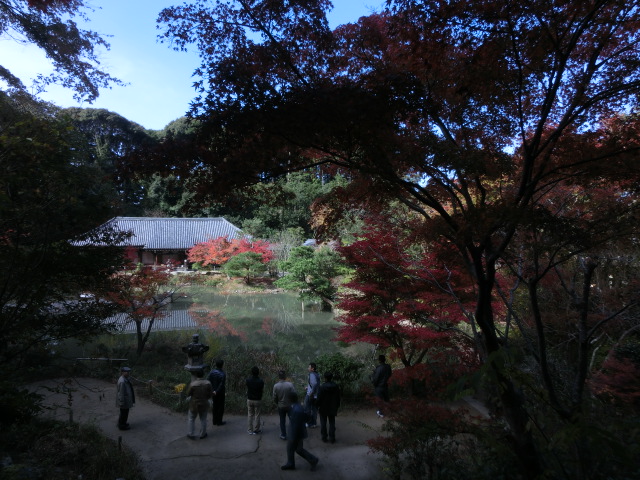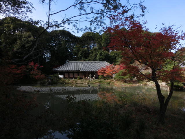 I and my wife went to Joruriji (temple) in the late afternoon of November 16th 2014, which is very famous for the statue of Kisshotennyo (the national treasurer) in Kamo town next to my home town. Though the autumnal tint of Japanese maple trees in the garden is famous, their red and yellow were not pure. I thought it was because the temperature had not fallen down yet. But they and the pond had a good contrast by the sunlight in the late afternoon.