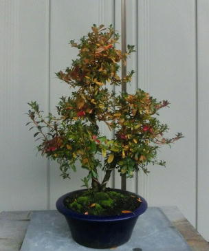 Satsuki trees are a kind of semi-deciduous trees. Therefore it is natural that all spring leaves fall down from the branches after the autumnal tint. And though a lot of satsuki trees keep some summer leaves near the flower buds, other summer leaves change the colour and fall down from the shoots after the autumnal tint. And, of course, a lot of semi-deciduous trees have the mechanism of autumnal tint in the leaves, but some varieties of satsuki trees have not only this mechanism of autumnal tint but also other phenomena of changing colours of all leaves or never have it under the different conditions to grow.