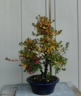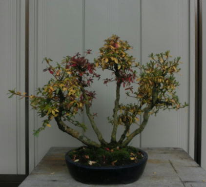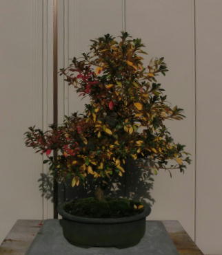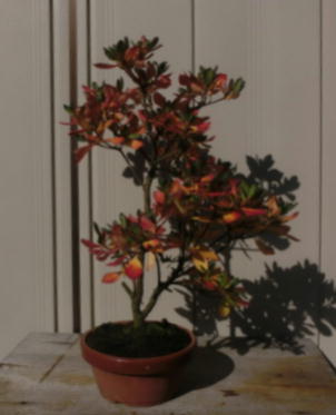 Now I would like to think why some satsuki trees have the mutlicoloured leaves in autumn. They are not only beautiful but also make us think why the green leaves turn multicoloured. When seeing several multicoloured flowers which a satsuki tree has, a lot of people are deeply impressed by the beautiful flowers and wonder why the tree has such flowers.