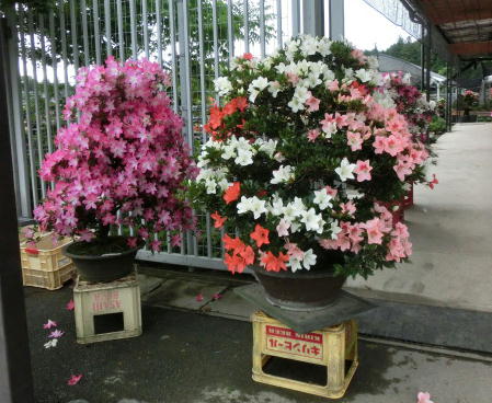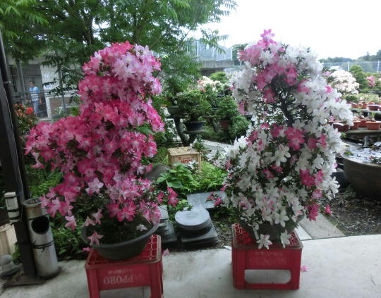 Dropping in Rakujuen, I could see two tall satsuki trees which were in full bloom. Since the owner does not have any exhibition rooms, a lot of trees of flowering plants were put on the beer boxes on the ground.