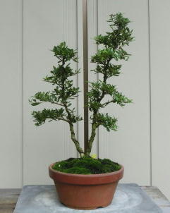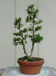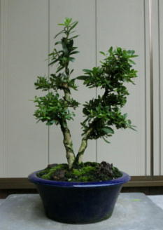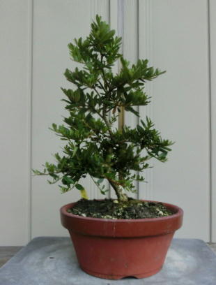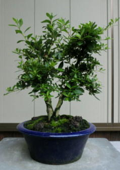 The left photo is Hoshi no kagayaki. Since the progress of this tree is very slow, the height is very short and I have not styled it yet. It is so short and the flowers are so small that we can style it into a very small bonsai or a small one. The middle photo is Jukokan whose age seems to be about 8. But since I have not styled it with wires yet, I have to style it drastically by cutting the trunk very short or changing the angle of the trunk after wiring it when repotting it. The colour arrangement of flowers is good. The right photo is Jukokan, too. The colour arrangement is good, and the style of two-trunked tree is good. Since both trees have smaller leaves than their parent, the progress of growth is slow, but I would like to plant the latter in a bonsai pot when repotting it next time.