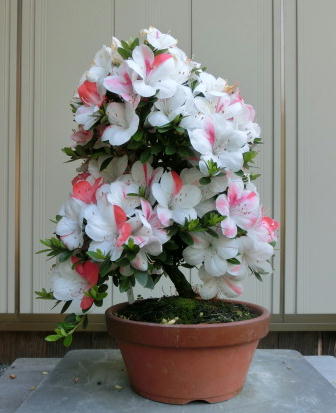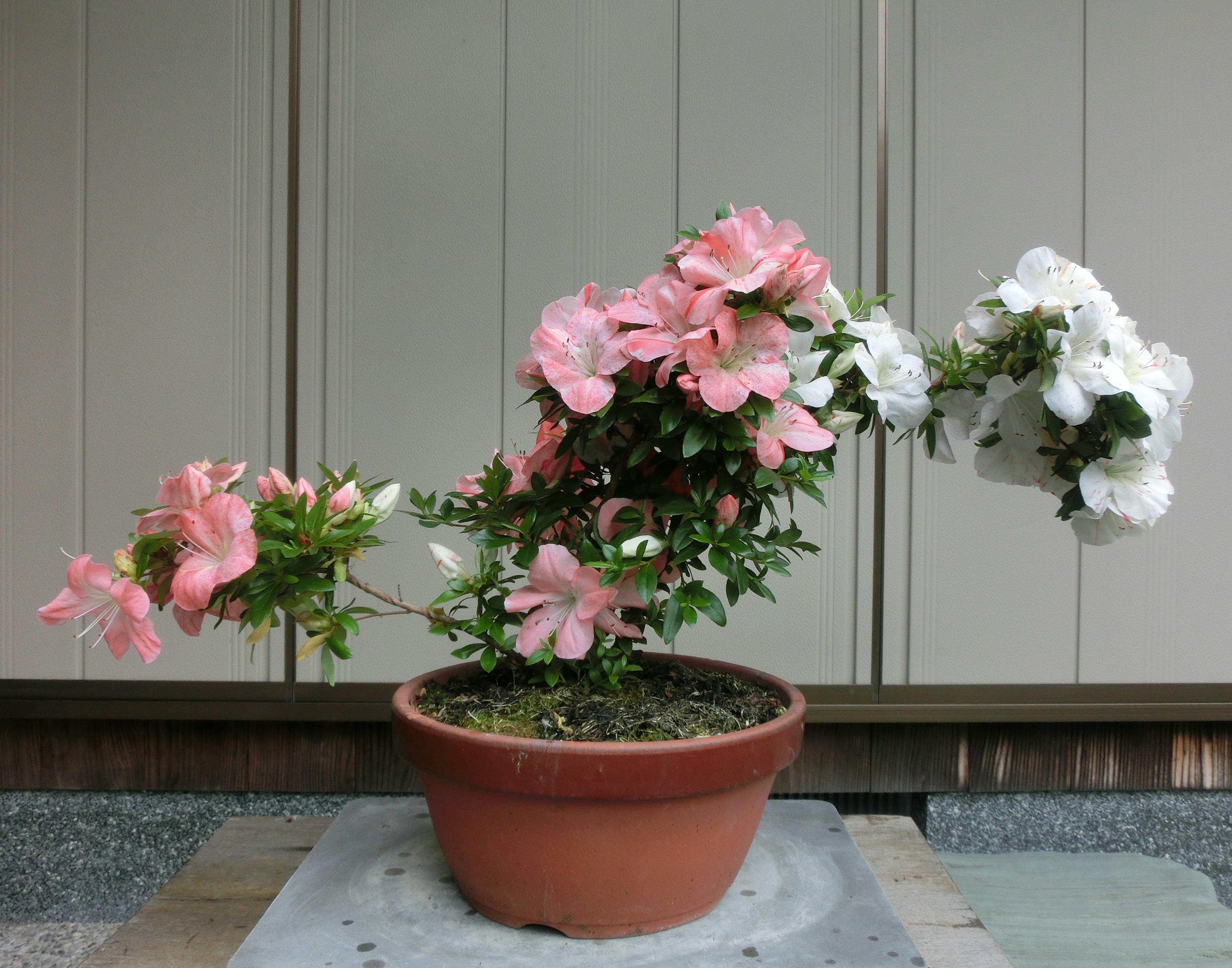 The left photo is Togenkyo whose age is more than 10. The bottom of trunk is very thick and the style of tree as a cascade is good. But though the colour arrangement of flowers is not good, I cannot cut the trunk drastically short because the style is a cascade. And I did not give a lot of fertilisers to it last spring because I had to repot it after blooming, but it has a lot of red flowers. Therefore I have to continue to remove the shoots which have red flowers whenever pruning it after blooming.