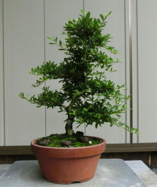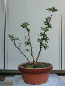 I have 8 young trees of Kogetsu as the materials for my web site. Last year they had a lot of long new shoots in the midsummer though I had pruned them after blooming. Therefore I decided to prune them again though I was afraid whether they would have a lot of lowers in the next flower season or not because it was my first experience. But fortunately they had a lot of flowers in next May, that is, I had good results. Therefore I would like to show their flowers in 2017, the pruning of 3 trees in the bonsai pots and the trimming of 5 trees in the terracotta pots in the midsummer again.