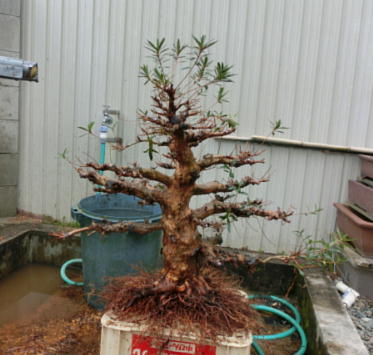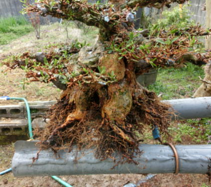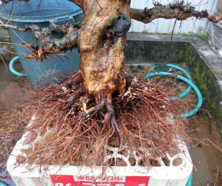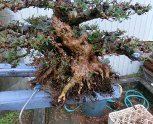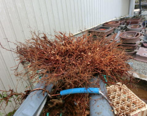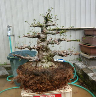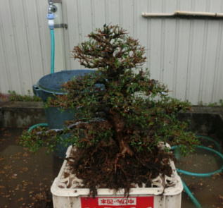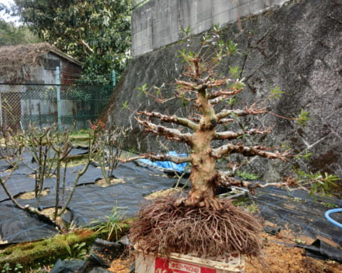 I dug up this large satsuki tree from the main nursery on March 10th because it did not have any large scars and had a very good taper and style. It was very easy to dig it out from there, remove the soil and wash the roots. It is Nikko S which I introduced in the previous web site.