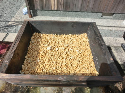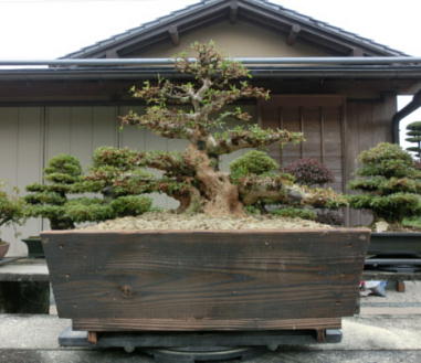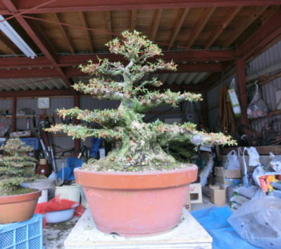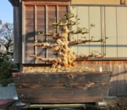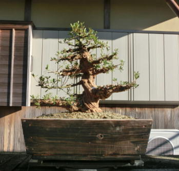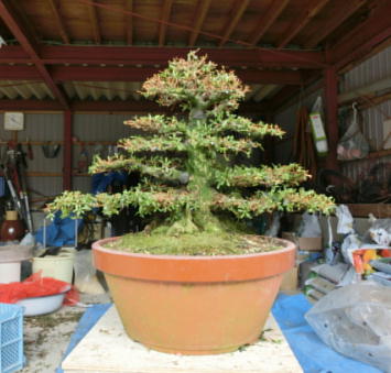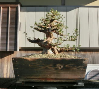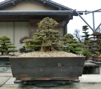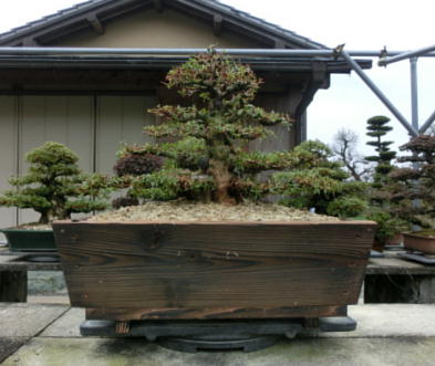 I planted this tree in one of 6 very large wooden pots which I had ordered a friend of mine to make. The size is 65 cm x 54 cm x 23 cm. Even if a tree were very large, if I plant it in this wooden pot, I think I do not have to repot it for 5 years. But since these wooden pots are so large and heavy that I had to plant large trees on the shelves, I had to use Kanuma soil which I dried after I had washed it lest the speck of Kanuma soil should pour from the holes to the shelves and the grounds.
