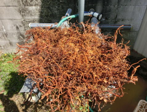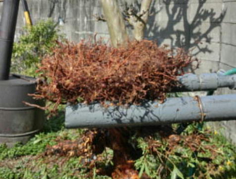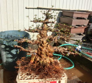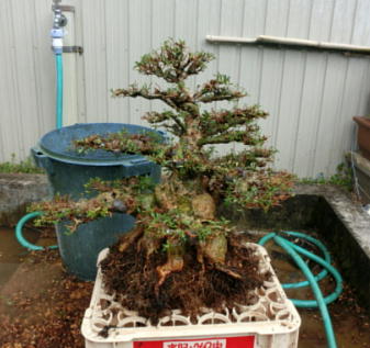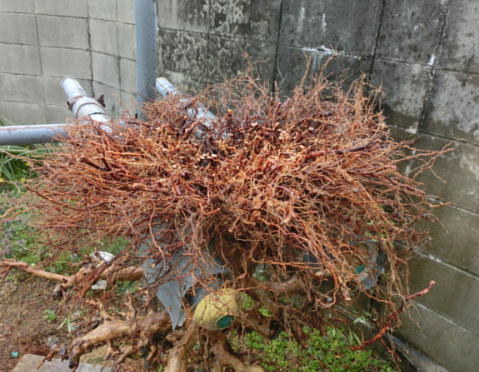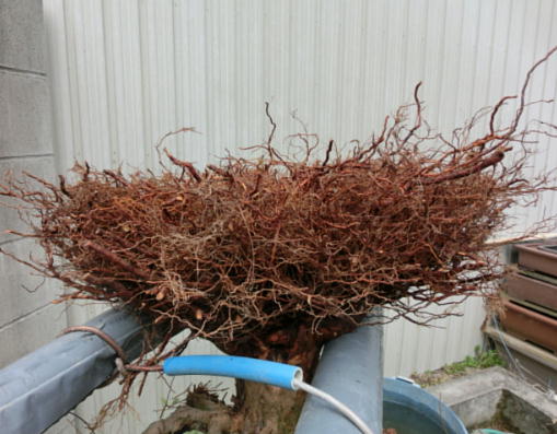 Though I cut the necessary roots short when removing the soil and washing the roots in the nursery, this tree has a lot of roots on the left photo. Therefore at first I cut the long and thick vertical roots short on the second one. And the third one is the roots after I removed unnecessary roots to organise them. This tree has the considerably good roots on the right photo after I organised the roots.