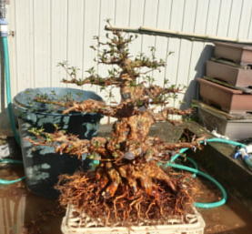 Therefore I think this tree is about 54 years old. Though it had spread the vertical roots through the Kanuma soil into the clay in the second nursery, since they were not very long, it was not the very hard work to dig it out on March 8th. But since it was so heavy that I could not carry it to the washing place, I had to remove the soil and wash the roots there. You can see the front side of this tree after I washed the roots there on the left photo. The second photo is the roots which is very thick because I have not dug it out for a long time. And though this tree has a big scar on the trunk, it has very good thin roots on the third one, too. After I cut the thick roots very short and organised the roots, this tree still has a lot of thin roots on the right photo. It means that it is in the good condition of growth.