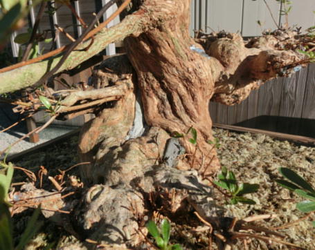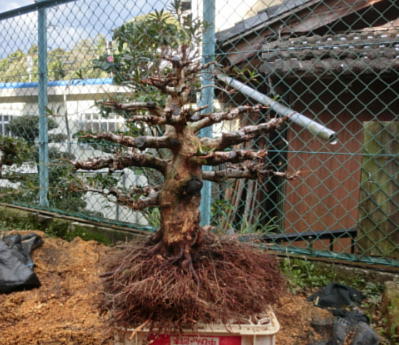 I removed the unnecessary roots and organised the roots to make some holes between toots near the bottom of the trunk. You can see them between the roots of the front side on the left photo and between the roots of the back side on the second photo. Since this tree has these holes near the bottom of the trunk, the water can reach under the trunk when I water it. Therefore it is very important that a very large tree has some holes near the bottom of the very thick trunk. In this respect, if a large tree has a large Bankon (clumpy roots) it is very dangerous because the water does not reach under the bottom of the trunk when you water it. If you do not have some special cares, it will die.