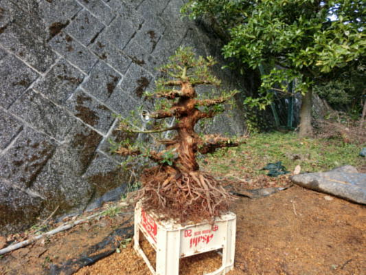 The left photo is the front nebari after my washing roots, and the second one is the nebari of the back side. The third one is the front side of this tree which was planted in a very large wooden pot. The fourth one is the back side. When we wash the roots, if we wash the trunk and branches, too, the whole shape of tree will be beautiful. The height is 50 cm and the trunk girth is 52 cm.