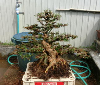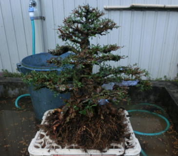 I bought this Kozan A for 50,000 yen in 1991. The height was 43 cm and the trunk girth was 22 cm. I cut the trunk short in1993. And I planted it in a very large wooden pot in 1997 to make it grow large and repotted it in a large terracotta pot in 2006, 2011 and 2015. Since I thought this pot was small, I repotted it in the very large wooden pot on March 21st, 2019. The left photo is the whole figure before repotting. The second one is the front side of the roots after washing. The third one is the back side of the roots. And the right one is the back of the roots. Judging from these photos, the condition of the roots is not very good though this tree has a lot of thin roots. This is the other reason why I repotted it in the very large wooden pot.