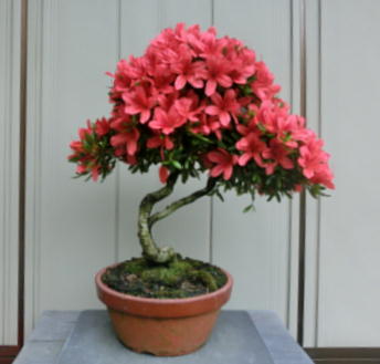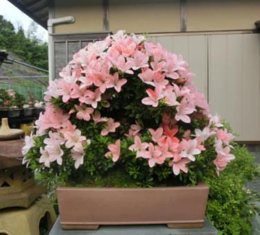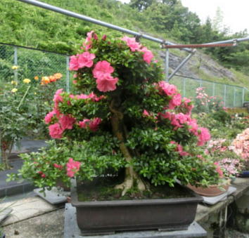 I would like to show you three photos of satsuki flowers. The left one is the flowers of Shintaiyo. When we bought an old house in Ise city in 1978, I dug it out from the garden. Though I planted it in a large terracotta pot after washing the roots, I could not remove the rotten parts from the trunk. After I had removed all of them with a knife and a chisel in 1981, the lower part of trunk was hollow and the tree was like standing on two legs. It was so strong that I planted it in the bonsai pot in 2010. Since then, it has had a lot of flowers.