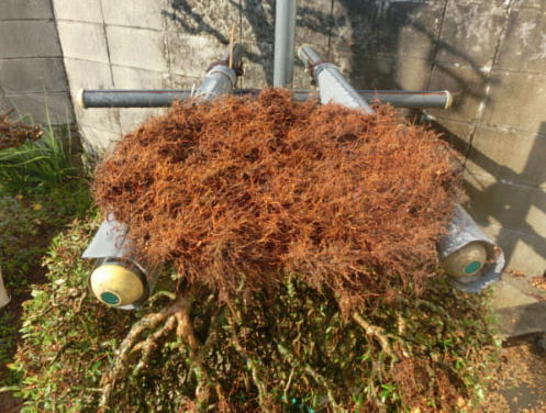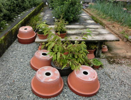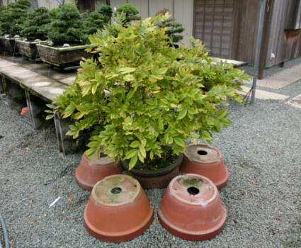 Whenever a typhoon is approaching to our district, I have to do a lot of things in the garden. Especially I have to have a lot of special cares for the plants in the pots. I have not only a lot of satsuki trees in the pots but also a lot of other plants in the pots: pine trees, Japanese maple tree, fringed orchids, wisteria, cherry trees, gourds and a lot of accent plants.