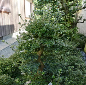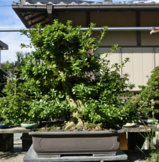 But, a large tree of Daigokuden A has been healthy and strong because it was planted in the garden between our house and the garage when we built them in 2001 though it had a large scar on the bottom of the trunk at that time. But since this scar has been small now, it is so strong and healthy that it always has a lot of long shoots and flower buds every autumn. Now I have 6 large, strong and thick-trunked trees which I have grown from the cuttings since 1973 or 1975. After they had been grown in the pots for a long time, they were planted in the nursery in 1990. One of them is Daigokuden B which was planted in a very large bonsai pot after it had been dug out from there in 2017. It is so strong without large scars that it has a lot of long shoots whose longest shoot is 43 cm at the end of October, 2019. The following Kogetsu has the same background as this Daigokuden B has.