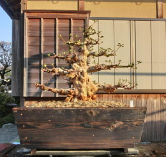 Of course I have very healthy and strong trees which I had planted in the nursery when having bought them, dug up from there and planted in the bonsai pots, too. You can see the whole figure of Juko on the left photo which was taken on March 25th, 2019. The height was 61 cm and the trunk girth was 50 cm. When I had dug it out from the nursery in March 2014 and planted it in the large bonsai pot, the height was 58 cm and the trunk girth 47 cm. And when I bought it for 30,000 yen in Kanuma in 1993, the height was 50 cm and the trunk girth 20 cm. Judging from there records, since I would like to grow the trunk as thick as possible, I repotted it in the very large wooden pot.