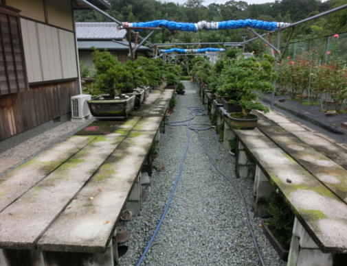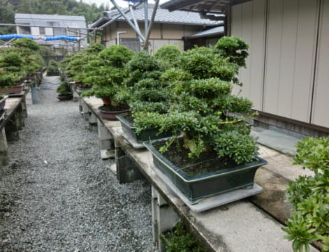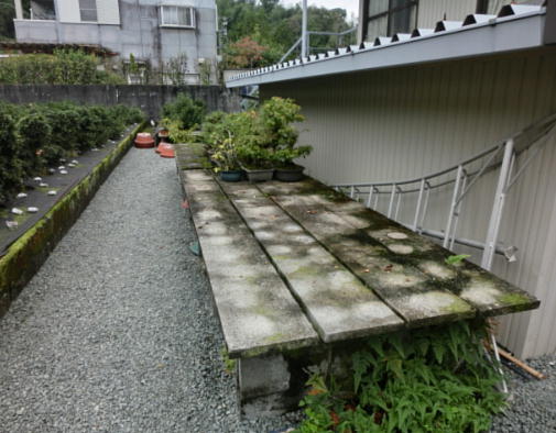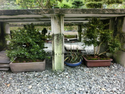 My bonsai shelves of satsuki on the left photo are defended perfectly from the south winds by the small hill which is in front of our garden. Since it is not high, all of my trees on the shelves can have the sunlight through a day. They on the second photo are protected from the west winds by the neighbour’s house and defended from the north winds perfectly except both ends of them by our house. If I put small satsuki trees under the west ends of shelves, they have the strong north winds through the space between our house and the garage which you can see on the third photo. Therefore I cannot put any small plants in the pots there. And they on the right photo are protected from the east winds by the woods which are not far from our house. You cannot see any small and middle trees on the shelves because I put about a half of them under the shelves and brought the rest into the garage.