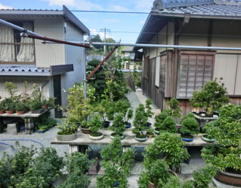 The left and second photos are the pine, quince and Japanese maple trees which were gathered. And the third photo is small shelves on which three young cherry trees were put, and a Kawazu cherry tree in the very large and deep bonsai pot on the ground, which is protected by three very large terracotta pots and a large bonsai pot. A lot of small satsuki trees were brought into the garage. You can see a large wisteria in the very large and deep bonsai pot on the right photo, which is protected by five very large terracotta pots. Since this Kawazu cherry tree and the wisteria were planted in the mountain soil in the very large and deep bonsai pots, they are so heavy that I cannot bring them to other places and I think they will not be blown even by the very strong winds.