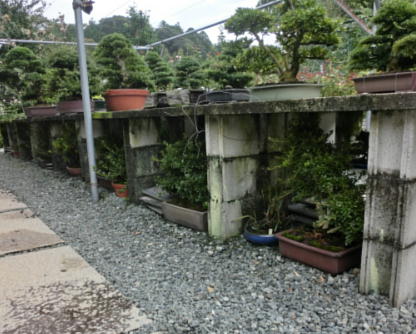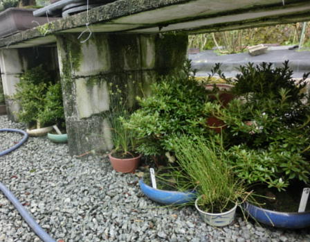 Since the walls of concrete blocks under the shelves are the fences which can defend a lot of things from the east and west winds, I can put a lot of small and middle trees and the small plants in the pots on the ground under the shelves. The left, second and third photos are small and middle trees under the shelves. But I cannot put them under the east ends of shelve because they have the very strong winds from the north. I put some turn tables there because they are heavy.