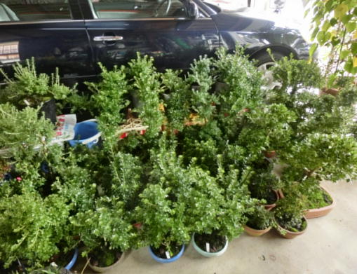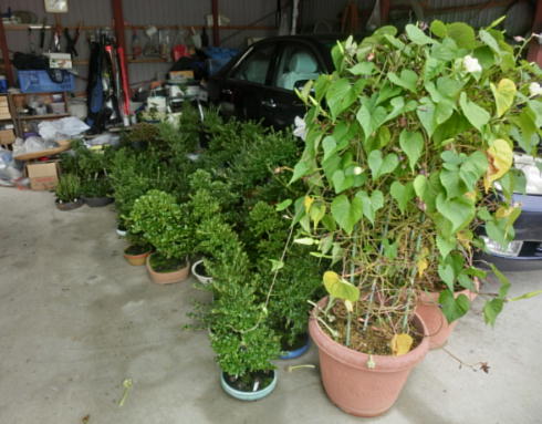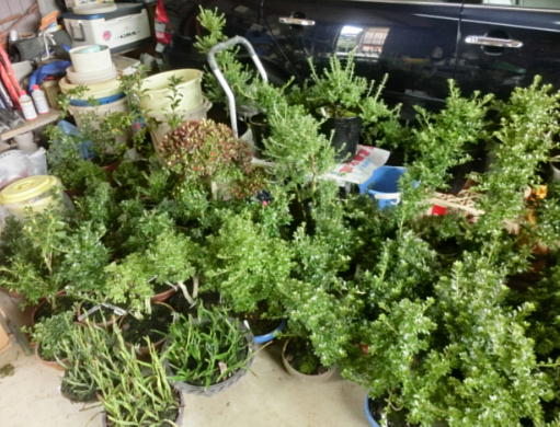 And I brought tall young trees, kengai, a lot of small trees and plants in the pots into the garage. Since I could not put them under the shelves, I had to bring them into the garage. And I put several middle satsuki trees on the east corner under the eaves. Since they are protected from the east, west and north winds perfectly by the house, I put them there to save my power. But I feared that the leaves would have some damages from the strong south winds. Though you can see a lot of plants in the pots on the left photo, they are not all plants which I had to bring into the garage. The number of all plants that I brought there was 71 on the second and third photos. The right one is the middle satsuki trees on the corner under the eaves.