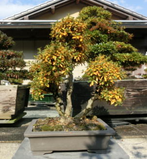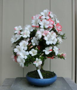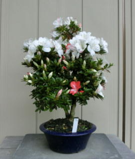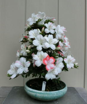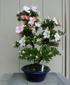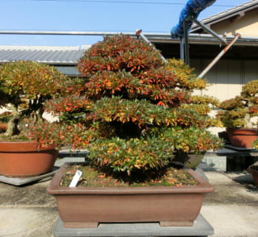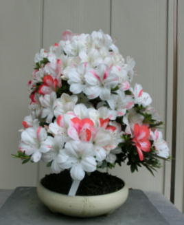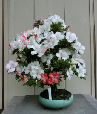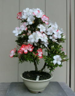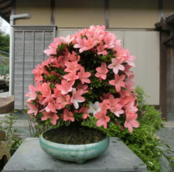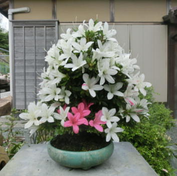 Though it is very easy to make satsuki trees which have single-coloured flowers have a lot of flowers, it is very difficult to make those which have multi-coloured flowers have good colour arrangements of flowers. It is a fact that we can never see these trees of a variety having the same colour-arrangement of flowers every year.