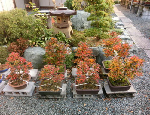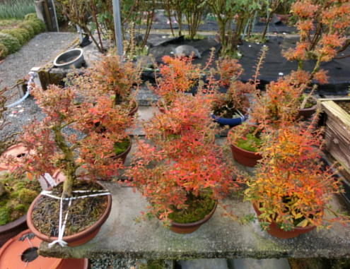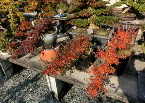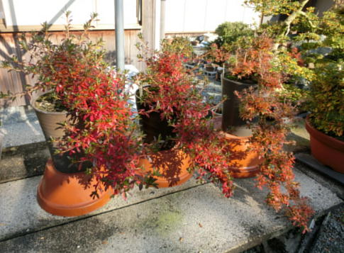 The trees of the left photos are Togenkyo which I have used as the material for this web site. Since I didn’t give any fertilisers to them in October, these coloured leaves are beautiful. But since we can see a lot of red leaves, these trees will have a lot of flowers which Kinsai has. And two trees which were repotted last March don’t have beautiful coloured leaves. Since the soil in the pots of them couldn’t keep fertilisers earlier than that in the pots of other trees, the colours of autumn leaves fade earlier. But since these trees are young, I can think I had to give them a lot of fertilisers in October to make the trunks thicker.
