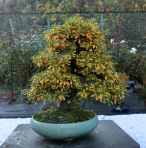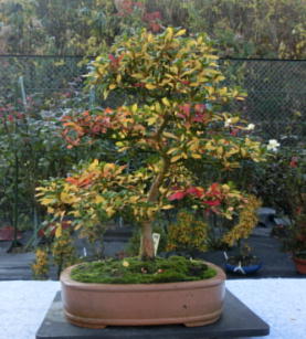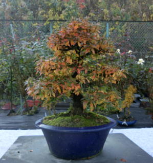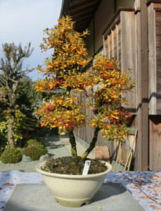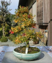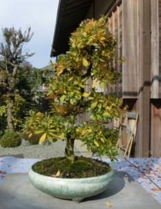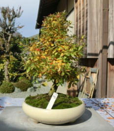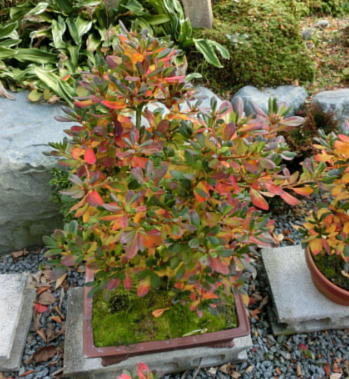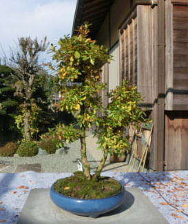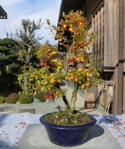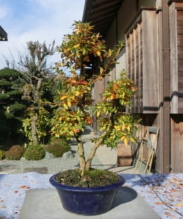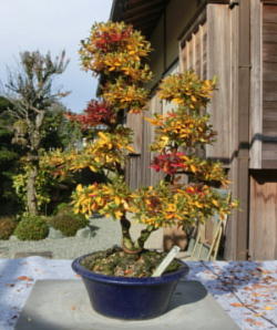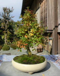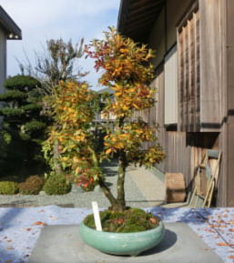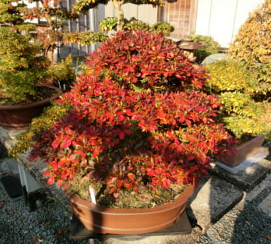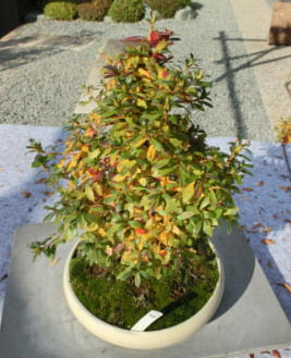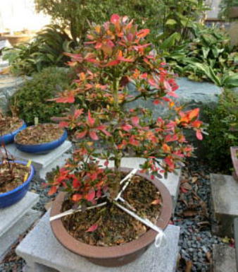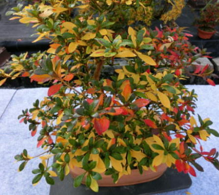 Even if you grew several satsuki trees of a variety under the same condition, they begin to have coloured leaves at different times if they were not repotted at the same year. And the beauty of coloured leaves in autumn depends on the weather in summer and autumn much more largely than on the quantity of fertiliser and water.