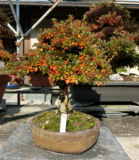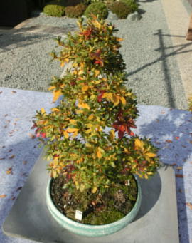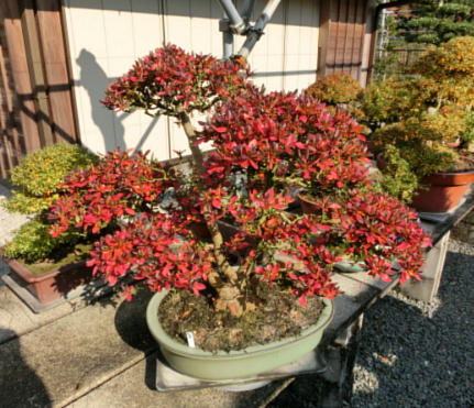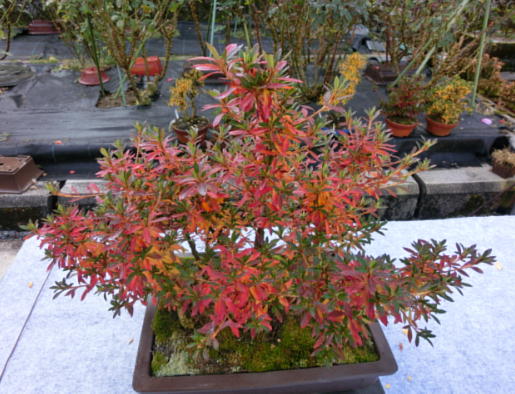 You can see a lot of coloured leaves of a lot of satsuki trees on the second photo. It is interesting that three cascades have different colours of autumn leaves. The right tree is Togenkyo and the middle is Hikorin. The left tree is questionable. Though it has the same form and size of leaves and the same form and colour of flower as Hikorin has, the size of flower is larger. Though I have called it Hikorin, it may be wrong when we see the coloured leaves on the photo. It is because they are near those of Korin. But the size, form and colour of flower are different from those of Korin. To tell the truth, I found a seedling under a large Korin in the very large terracotta pot about 15 years ago. Watching the autumn leaves of satsuki trees, we often can identify a variety of satsuki.