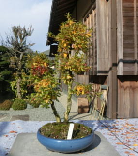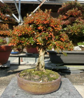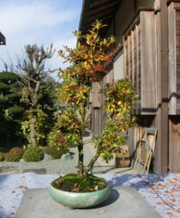 These three trees are small sizes of satsuki bonsai. The left photo is Nikko, the second is Nyohozan and the third is Nikko. The right is the root connected group of Korin. These four trees keep the best views before the coloured leaves will fall when I took these photos.
