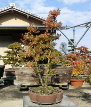 The left photo is the front side of this tree and the second is the back side. The style is good and these coloured leaves are very beautiful. The coloured leaves of the back sides of 8 young trees of Kogetsu are much more beautiful than those of the front sides. It is because I hadn’t turned the turntables one week before I trimmed them. This is one of my errors. We have to do anything to do at the suitable time.
