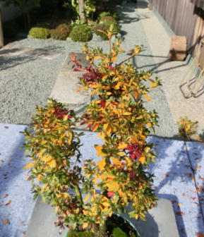 We had a lot of coloured leaves of a lot of trees near our houses last autumn, which were not very beautiful. Since each species of trees has each time when the leaves begin to turn the colour to red, yellow and brown in autumn, we could see the very beautiful coloured leaves of some species of trees. And we could enjoy the coloured leaves of every tree longer than usual. To my surprise I could see a lot of coloured leaves of some species of trees including my satsuki trees on Christmas day.