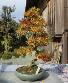 The left photo is the front side of five-trunked Kusudama. Since it was repotted last March, it doesn’t have a lot of leaves. Therefore all leaves turned the colour almost simultaneously, so that they are beautiful. And the back side is much more beautiful because I took the second photo from above.