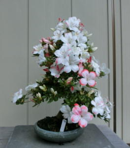I would like to show you three photos of the flowers of satsuki trees which I have grown from the cuttings. Perhaps these trees are 16 or 17 years old. Since they are short and the trunks are not very thick, they are very portable and save spaces. Therefore these types of bonsai are very popular in Japan. And everybody can make these types of trees from the cuttings easily for a short time and enjoy seeing beautiful flowers even if they were 5 or 6 years.