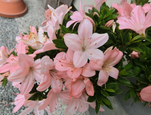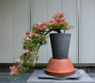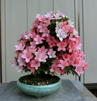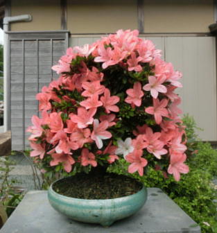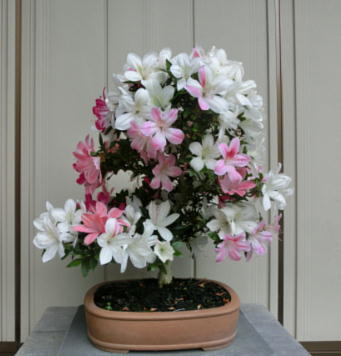 I would like to show you three photos of the flowers of satsuki trees in 2019, which I have grown from the cuttings. The left photo is Yama no hikari which is about 15 years old. The flowers of combination colour and red are very beautiful without white flowers. At first I had this variety which had only red flowers. But it had a flower whose half was red and other half was white after about ten years. And at last it had some white flowers. But I gave this tree to one of my friends.